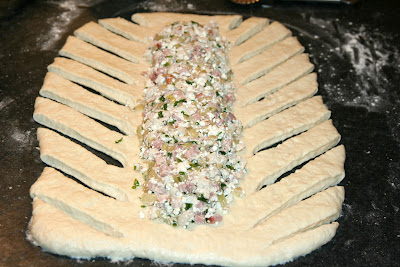 Aluatul il intindem cu sucitorul , impartim in 3 pe lungime , trecand cu cutitul fara a taia aluatul, apoi pe partile laterale taiem fasii oblice de 4 cm, de la exterior spre interior. Pe mijloc asezam umplutura.