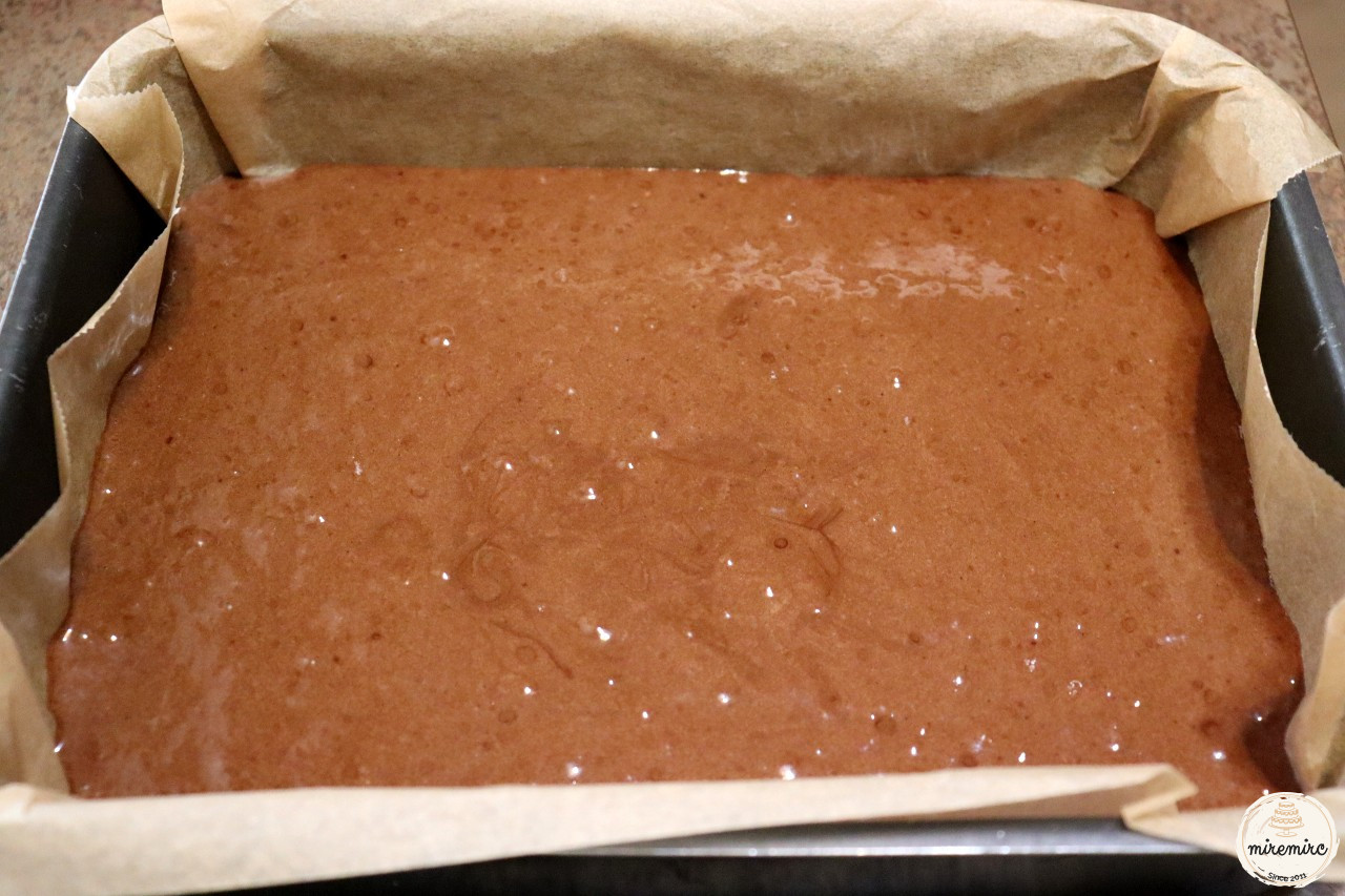 Intr-un bol mixam spuma ouale cu un praf de sare, zaharul si zaharul brun, circa 4 minute. Peste compozitie adaugam ciocolata cu untul de mai sus, mixand incet . La urma cernem faina peste si amestecam cu o spatula cat sa se incorporeze faina. Compozitia o turnam in tava (20×30 cm) tapetata cu hartie de copt. Coacem in cuptorul preancalzit, la 180 grade Celsius, circa 20-25 minute.